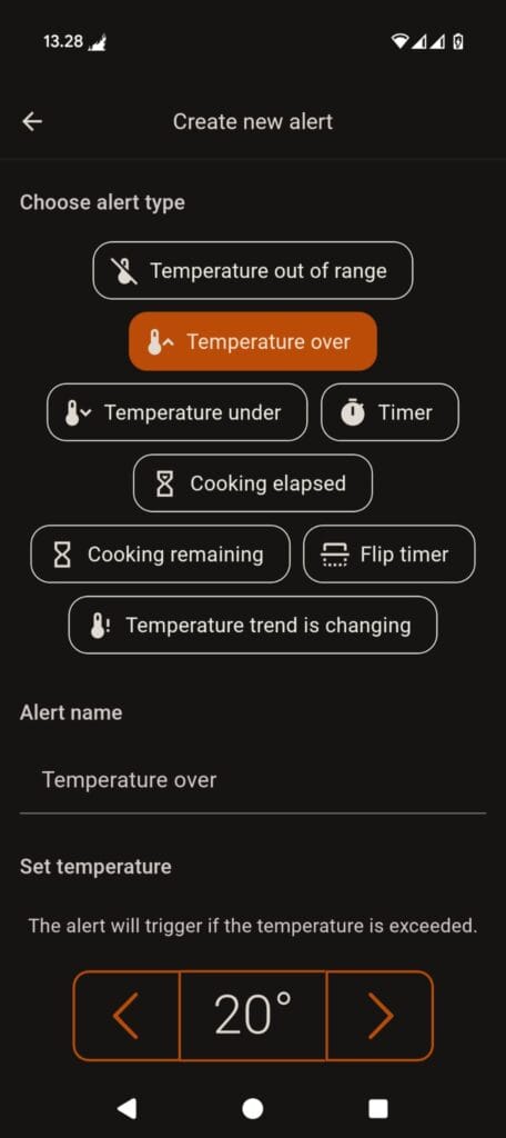 - Temperature trend is changing – Alerts you when the temperature trend starts to rise or fall unexpectedly. This alert will help you notice changes in the cooking temperature (beta feature).